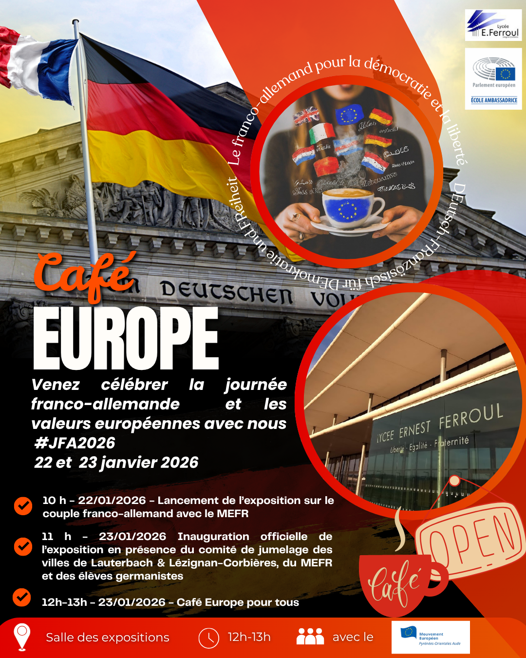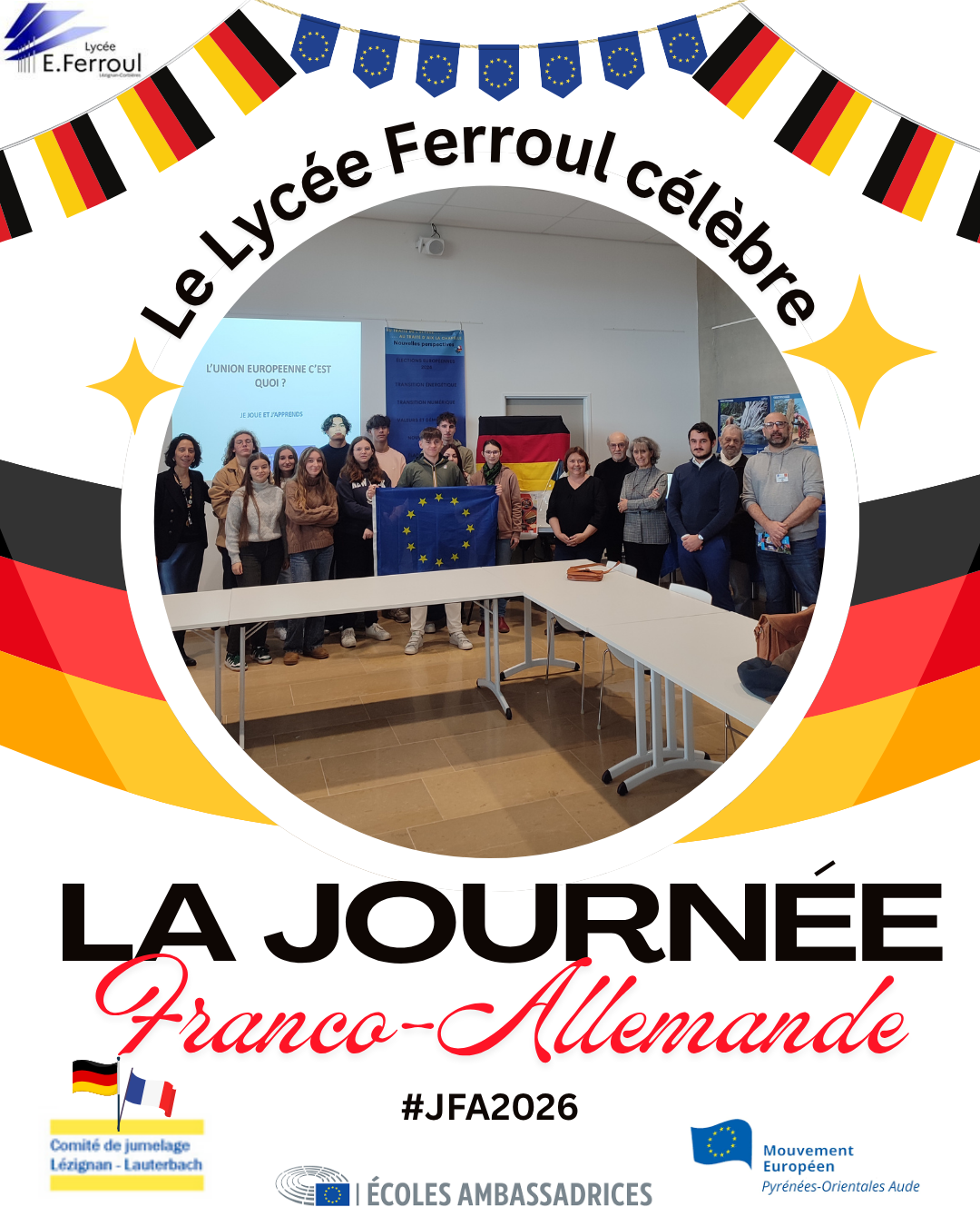 Le lycée Ernest Ferroul a célébré et fait vivre l'amitié franco-allemande au travers de l’exposition « Du traité de l’Élysée au traité d’Aix-la-Chapelle : l’amitié franco-allemande au cœur de la construction de l’Union européenne », gracieusement prêtée par le Mouvement Européen, animée et enrichie par les commentaires et l'expertise de Monsieur Duclos, professeur de Lettres-Histoire et Madame Garcia, membre du Mouvement européen section Pyrénées-Orientales/Aude, du 22 au 28 janvier 2026 en salle des expositions.